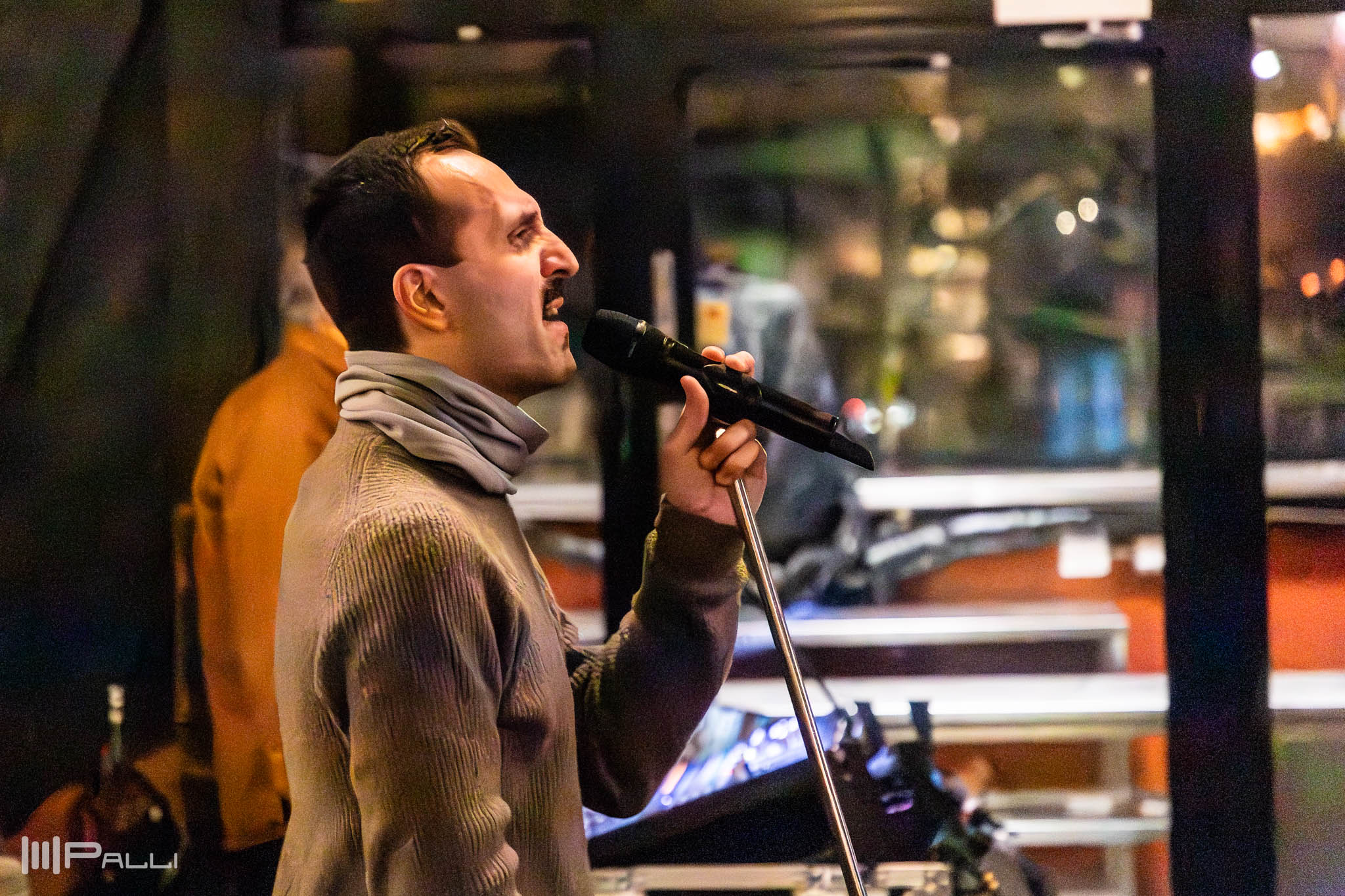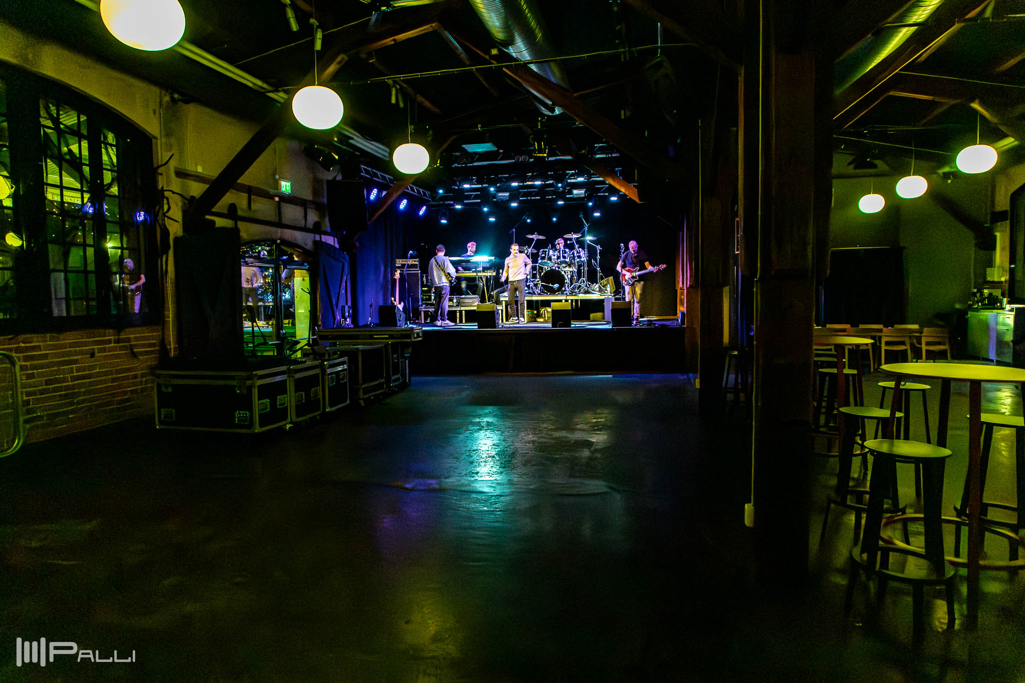 Bandets sångare har gått längst bort i lokalen och ger järnet för att höra hur det låter ute i lokalen.